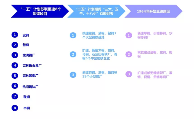 在1949年~1978年的這30年里,從“一五”計劃期間前蘇聯(lián)援建8個鋼鐵項目(新建武鋼、包鋼、北滿鋼廠、吉林鐵合金廠、吉林炭素廠、熱河釩鈦廠,改擴(kuò)建鞍鋼和本鋼等),到“二五”計劃期間原冶金部提出建設(shè)“三大、五中、十八小”戰(zhàn)略部署(續(xù)建鞍鋼、武鋼、包鋼3個大型鋼鐵基地,擴(kuò)建、新建太鋼、重鋼、馬鋼、石景山鋼鐵廠、湘鋼5個中型鋼鐵企業(yè),新建邯鋼、濟(jì)鋼、臨鋼、新鋼、南鋼、柳鋼、廣鋼、三明鋼廠、合鋼、長城特鋼、新疆八一鋼廠、杭鋼、鄂鋼、漣鋼、安鋼、蘭鋼、貴鋼、通鋼等18個小型鋼廠),再到1964年開始的三線建設(shè)(新建攀鋼、長城特鋼、水鋼等鋼廠,恢復(fù)建設(shè)酒鋼、蘭鋼、略鋼,擴(kuò)建成都無縫鋼管廠、重鋼、昆鋼、貴鋼等鋼廠),鋼鐵工業(yè)掀起了三次建設(shè)高潮,初步建立起了包括采礦、選礦、燒結(jié)、煉鐵、煉鋼、軋鋼、焦化、耐火材料、鐵合金、炭素等比較完整的要素結(jié)構(gòu),地質(zhì)勘探、工程設(shè)計、建設(shè)施工、設(shè)備修造、科學(xué)研究、冶金教育等比較齊全的行業(yè)門類,以大型企業(yè)為骨干、“大中小”相結(jié)合、具有3500萬噸鋼生產(chǎn)能力的新中國鋼鐵工業(yè)體系。